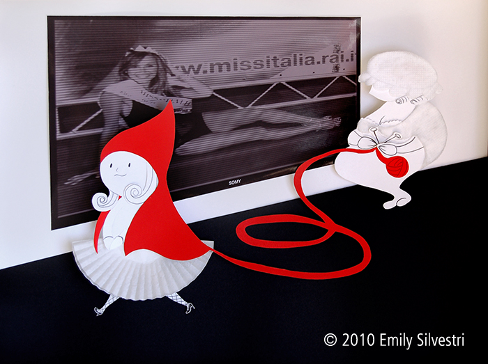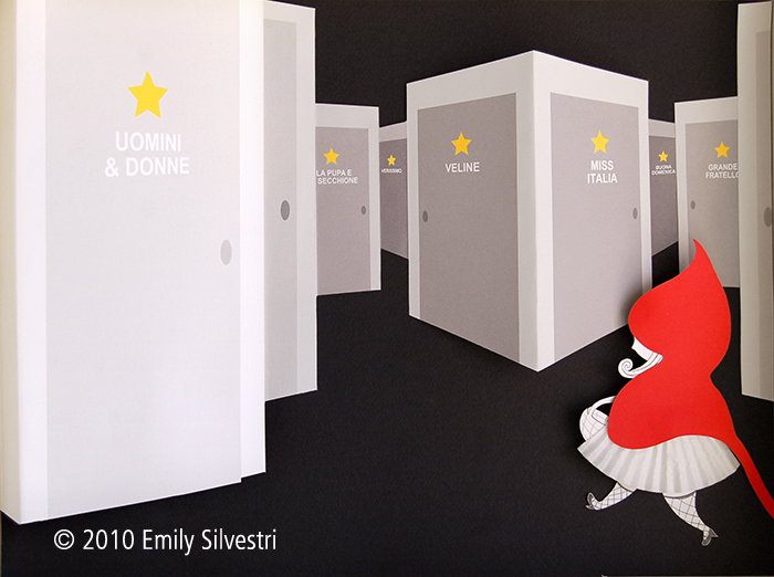 ‘Cappuccetto Rosso’ si occupa di alcuni problemi cruciali che la ragazza in età scolare deve risolvere se nel suo subconscio, permangono attaccamenti edipici, che possono indurla e esporsi pericolosamente alla possibilità di essere sedotta. […] Una ragazzina ha bisogno di una forte figura materna per la propria protezione, e come modello da imitare. Ma la nonna di Cappuccetto Rosso si lascia trasportare dalle proprie necessità oltre quanto è di beneficio per la bambina, […] è fatale per la ragazzina se questa donna più anziana rinuncia alla sua capacità d’interessare sessualmente gli uomini e la trasferisce sulla nipotina donandole un mantello rosso che la rende troppo seducente. In tutta la fiaba, nel titolo come nel nome della ragazzina, l’accento è posto sul colore rosso, che essa indossa in modo manifesto. Il rosso è il colore che simboleggia le emozioni violente, naturalmente comprese quelle sessuali. Il cappuccio di velluto rosso dato dalla nonna può quindi essere visto come il simbolo di un prematuro trasferimento di attrazione sessuale, che è ulteriormente accentuato dalle condizioni della nonna, vecchia e malata, troppo debole perfino per aprire una porta. Il nome Cappuccetto Rosso indica l’importanza fondamentale di questa caratteristica della bambina nella storia. Esso suggerisce che non il cappuccio è piccolo, ma è piccola anche la bambina [in francese il titolo originale è ‘Le Petit Chaperon Rouge’n.d.r.]. E’ troppo piccola, non per portare il suo cappuccio, ma per dominare ciò che esso simboleggia, e ciò che il semplice fatto di portarlo incoraggia. Il pericolo per Cappuccetto Rosso consiste nella sua sessualità in boccio, per cui essa non è ancora abbastanza matura dal punto di vista emotivo.”Il confronto con le ragazzine di oggi è palese, esse vengono continuamente spinte verso una prematura sessualizzazione da televisione, video musicali, testi delle canzoni, internet, riviste, film e video giochi anche se di target infantile. Tipico esempio sono le Veline, diventate il modello di moltissime bambine che vedono la realizzazione dei proprio sogni nel comparire in televisione, attraendo gli spettatori con il proprio corpo come oggetto sessuale e ornamento estetico. Gli stessi genitori, come la Nonna della fiaba, incoraggiano e accompagnano le figlie femmine verso una carriera televisiva che le porterebbe a essere viste come un oggetto sessuale. In queste illustrazioni la nonna della fiaba, affascinata dai modelli mediatici, tesse la mantellina rossa alla piccola nipote per farla diventare provocante e farla entrare in un labirinto di studi televisivi in cui si perderà.
