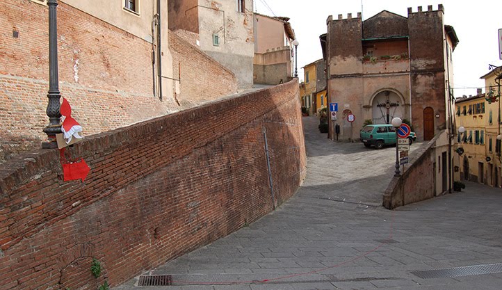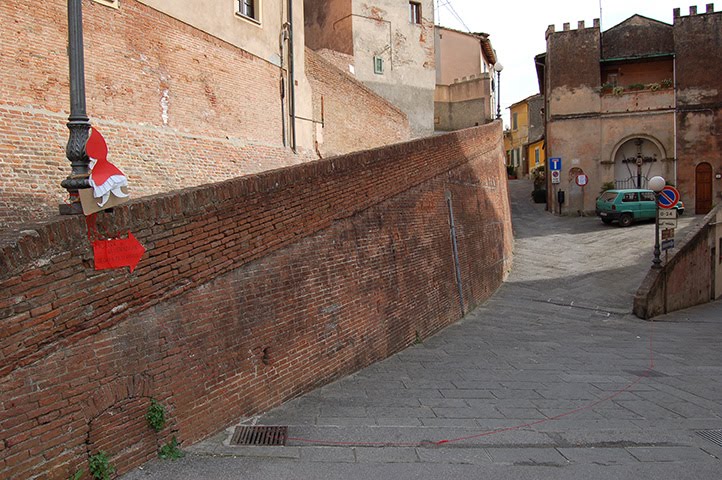 Per indicare la via della mostra ho fatto questa installazione artistica nella piazza davanti il Comune: è la Cappuccetto Rosso di una illustrazione che sto realizzando per il progetto Donne ex Fabula, una futura mostra sulle fiabe e il ruolo della donna che faremo prossimamente alla Stazione Leopolda di Pisa.